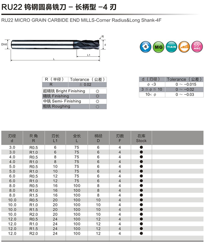 RU22鎢鋼圓鼻銑刀-長(zhǎng)柄型-4刃