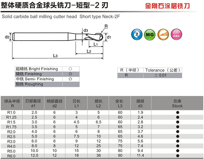 整體硬質(zhì)合金球頭銑刀-短型-2刃