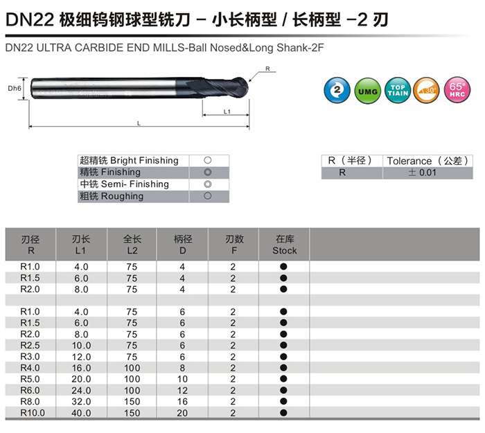 DN22極細鎢鋼球型銑刀-小長柄型/長柄型-2刃