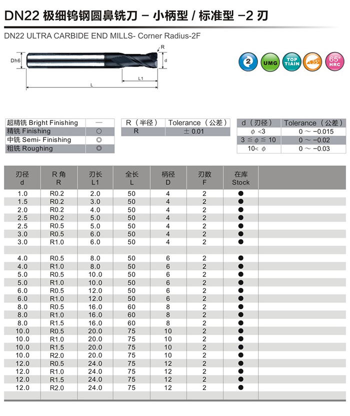 DN22極細鎢鋼圓鼻銑刀-小柄型/標準-2刃