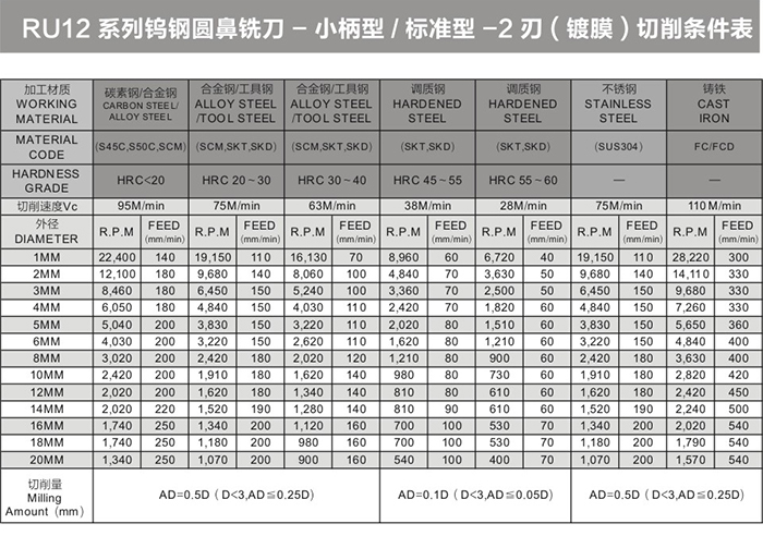 RU12系列鎢鋼圓鼻銑刀-小柄型/標準型-2刃(鍍膜)
