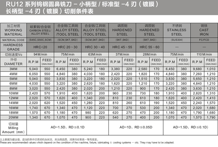 RU12系列鎢鋼圓鼻銑刀-小柄型/標準型-4刃(鍍膜)